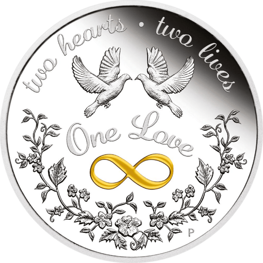 Die 2023er One Love Münze wurde von der hervorragenden Perth Mint Prägestätte aus einer hochwertigen 1 Unze reinem Silber mit einer Feinheit von 999,9% geprägt. Das atemberaubende Design auf der Motivseite zeigt zwei wunderschöne Tauben, die sich in inniger Zweisamkeit umschlingen. Ein goldenes Unendlichkeitssymbol, das für die ewige Liebe steht, sowie ein kunstvolles Muster aus Blumen und Blättern ergänzen das romantische Motiv. Darüber hinaus sind die Inschriften „Two Hearts“, „Two Lives“ und „One Love“ sowie das traditionelle Münzzeichen „P“ der Perth Mint in das Design der Münze eingearbeitet. Die Rückseite ziert das Porträt von Königin Elizabeth II., das vom bekannten Münzdesigner Jody Clark gestaltet wurde. Die Angaben zur Feinheit, zum Ausgabejahr und zum Nennwert sind ebenfalls auf der Rückseite zu finden.
