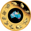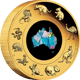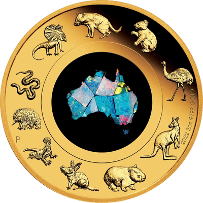 Im Inneren dieser Goldmünze befindet sich ein echter Opal, der in unterschiedlichen Farben leuchtet. Umrandet wird dieser von einigen in Australien beheimateten Tierarten, wie dem Känguru und dem Koala.