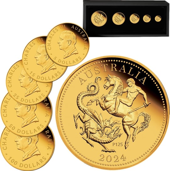 Die fünf Münzen dieses Sets sind jeweils mit einer Darstellung des Heiligen Georg geprägt, einem römischen Wächter und christlichen Märtyrer, der laut Überlieferung eine Prinzessin vor einem Drachen gerettet hat. Diese Darstellung symbolisiert Mut und den Sieg des Guten über das Böse. Die Design-Elemente umfassen zudem die Aufschrift „AUSTRALIA“, das Ausgabejahr „2024“ und das Mintmark „P125“ zum Jubiläum der Perth Mint. Auf der Wertseite findet sich das Dan Thorne-Porträt von König Charles III sowie die jeweilige Währungsbezeichnung.