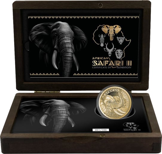 Das Motiv der Goldmünzen zeigt einen majestätischen afrikanischen Elefanten in atemberaubender Detailtiefe. Die Polierte Platte Ausführung bringt jedes noch so kleine Detail perfekt zur Geltung. Die Münze ist Teil der begehrten African Safari Serie, die auch als Silbermünzen erhältlich ist.