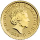 Links der Frauenfigur findet sich ein kleines, rundes Symbol, das zu einem höheren Kopierschutz führt. Bei den Schriftzügen wurde auf „BRITANNIA“, „2021“, „1/10 OZ“ und „999,9 FINE GOLD“ gesetzt. Die Rückseite ziert das seitliche Profil von Queen Elizabeth II. Der Nennwert beläuft sich auf „10 GBP“, als weitere Schriftzeichen werden „Elizabeth II“ und „D G REG F D“ verwendet.
