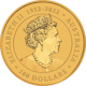 Die Motivseite dieser Goldmünze zeigt ein Känguru das auf einem steinigen und trocken aussehenden Untergrund steht. Auf dem Motiv wird nämlich die Landschaft des australischen Outbacks dargestellt, in dem sich das große Beuteltier sehr wohlfühlt. Im Hintergrund können Sie Bäume und Pflanzen sehen, die in Australien wachsen.