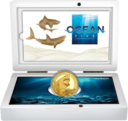Die Münzen werden in einem hochwertigen, weißen Etui in Klavierlackoptik geliefert. Das Innere des Etuis ähnelt der Gestaltung einer Unterwasserwelt. Die in die Unterseite eingelassene Acrylplatte eröffnet Ihnen den atemberaubenden Lebensraum des erfolgreichsten Raubtiers der Ozeane. Der raue Meeresboden wird erleuchtet vom Licht der Oberflächte, dass allmählich in der Tiefe verblasst. Die innere Oberseite des Etui bildet hingegen zwei sich windende Haie ab, die begierig zum Logo „Ocean Five“ blicken. Sie werden selbst feststellen: die Münze und das Etui harmonieren perfekt miteinander, sodass wir Ihnen ein stimmiges und höchst exklusives Produkt anbieten können, wie es die Edelmetallwelt noch nicht gesehen hat.