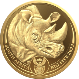 Die Münze präsentiert eine detaillierte Nahaufnahme des Nashorns, das mit seinen markanten Hautfalten und der kräftigen Statur Stärke und Widerstandsfähigkeit ausstrahlt. Die Aufschriften "SOUTH AFRICA" und "BIG FIVE 2022" schmücken den oberen und unteren Rand der Münze, während das südafrikanische Wappen direkt unter dem Nashorn von einem Lorbeerkranz umgeben ist. Die Rückseite zeigt zwei Hälften eines Nashornkopfes – ein innovatives Design, das bei Zusammensetzung zweier Münzen ein vollständiges Porträt ergibt.