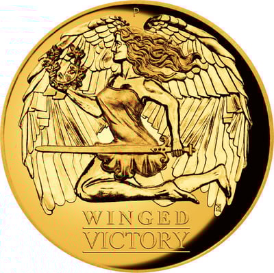 Auf der Münze sieht man die Siegesgöttin mit einem Lorbeerkarnz in der rechten Hand, welcher in der Antike als Siegessymbol galt und in der linken Hand hält Sie ein Schwert.  Mit ausgebreiteten Flügeln und wallendem Haar ist sie unterwegs um den Sieger zu küren. Unter der Frauendarstellung ist der Name Winged Victory zu lesen und darüner ist das Prägezeichen der Perth Mint zu sehen.