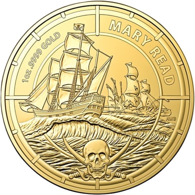 Die sagenumwobene Piratin Mary Read ziert die finale Ausgabe der Serie Pirate Queens. Die Münze aus 99,99% Gold zeichnet sich durch eine begrenzte Auflage von 100 Stück aus, die Sammlern und Investoren eine außerordentliche Wertsteigerungschance nahelegen. Das detaillierte Motiv zeigt ein Piratenschiff mit gehisster Totenkopf-Flagge, welches das Feuer aus allen Kanonen auf ein gegnerisches Schiff eröffnet hat. Unter der von Wellen aufgewühlte Szene ist ein Totenkopf mit zwei gekreuzten Säbeln abgebildet, wie er oft auch auf Piratenflaggen zu sehen ist. Die Aufschriften „1oz .9999 GOLD“ und „MARY READ“ runden das Motiv ab, das einem Bullauge nachempfunden ist. Die Rückseite zeigt das klassische Porträt der Königin Elizabeth II inklusiver der Angaben „ELIZABETH II„, „SOLOMON ISLANDS 2022“ und „100 DOLLARS„.