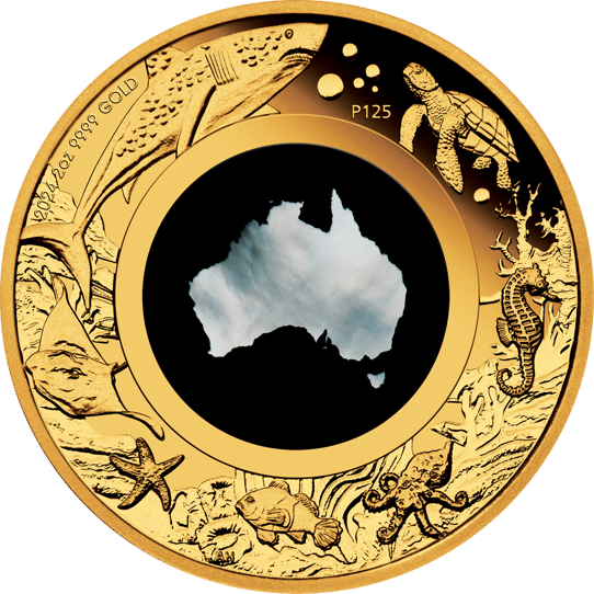 Zusätzlich sind Darstellungen von Meerespflanzen und das Prägezeichen „P125“ zu sehen, welches den 125. Geburtstag der Perth Mint im Jahr 2024 symbolisiert. Angaben über das Gewicht, den Feingehalt sowie das Prägejahr 2024 sind ebenfalls im Design integriert.