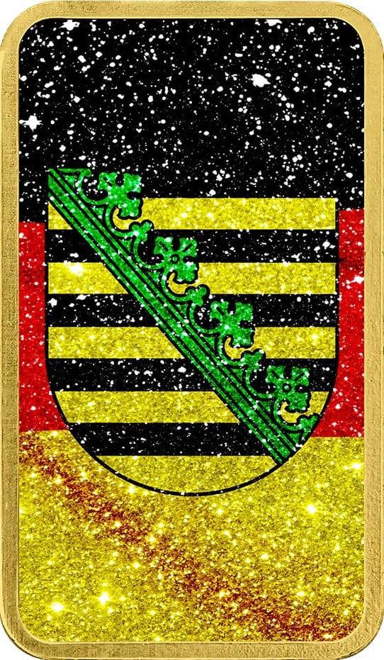 Der 1 Unze Silberbarren Sachsen wurde von Heimerle & Meule gefertigt und in Deutschland nachträglich kunstvoll veredelt. Die Vorderseite des Barrens zeigt die Deutschlandfahne, verziert mit verschiedenem Diamantpulver in Schwarz, Rot und Gold, sowie das mittig platzierte Wappen von Sachsen. Die Rückseite präsentiert eine Deutschlandkarte, auf der das Bundesland Sachsen rot hervorgehoben ist. Auch hier kommen die glitzernden Diamantpulver in Schwarz, Rot und Gold eindrucksvoll zur Geltung.