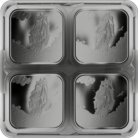 Die Vorderseite jedes einzelnen Square Coins zeigt ein majestätisches Segelschiff, das mit vollen Segeln durch die Wellen pflügt. Im Hintergrund ragen Palmen einer tropischen Küste empor, während ein Vogel – vermutlich ein Fregattvogel, wie er auf Ascension Island heimisch ist – über dem Schiff kreist. Die Detailtreue ist bemerkenswert: Vom filigranen Takelwerk bis hin zu den dramatischen Wolkenformationen zeugt jedes Element von meisterhafter Gravurkunst. Der Kontrast zwischen spiegelglatten und mattierten Flächen verleiht dem Motiv eine fast dreidimensionale Tiefe.