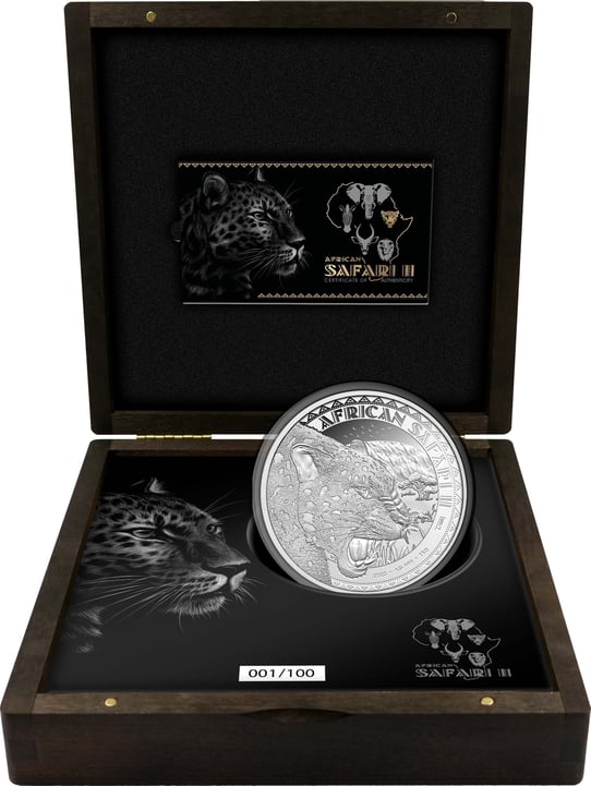 Die limitierte African Safari II Münze definiert den afrikanischen kulturellen Einfluss von neu. Egal ob mit Leoparden, Elefanten oder mehr, mit dieser Münze werden alle Sinne und Bedürfnisse gestimmt. So ein exklusives Design, das dazu noch stilvoll geriffelte wurde, erwies sich bei vielen Sammlern als begehrenswert. Die feine Umrandung und die präzise Verarbeitung der Münze wirken vielversprechend auf alle Silber-Liebhaber. Das silberne Motiv zeigt den Kopf eines ausgewachsenen afrikanischen Leoparden, während er mit seiner ganzen Pracht mit offenem Maul in die Gegend brüllt. Im Hintergrund ist die afrikanische Steppenlandschaft zu sehen. Entlang des Münzrandes befinden sich die Aufschriften „AFRICAN SAFARI II“ sowie das Gewicht „1 kg“ und die Feinheit „Ag 999.9“.