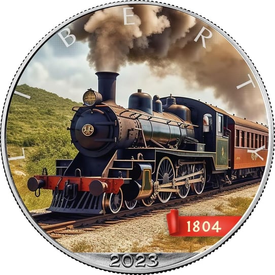 Das Motiv der Münze zelebriert die bahnbrechende Erfindung der Dampflokomotive. Das farbige Motiv zeigt eine Dampflokomotive auf ihrer Fahrt durch eine idyllische, grüne Landschaft. Am unteren Münzrand ist das Ausgabejahr "2023" zu sehen, während die Aufschrift "LIBERTY" den oberen Münzrand säumt. Die Rückseite der Münze zeigt den amerikanischen Weißkopfseeadler mit einem Eichenzweig in seinen Klauen. Umrahmt wird das Adler-Design von den Worten "UNITED STATES OF AMERICA", "ONE DOLLAR - 1OZ. FINE SILVER".