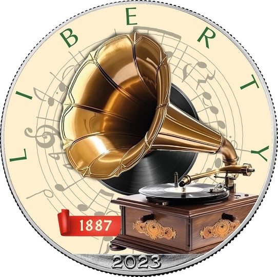 Die Sammlermünze ist Teil der beliebten "American Eagle" Serie der US Mint - United States Mint und zeichnet sich durch ihr einzigartiges Design aus. Auf der Vorderseite ist ein farbiges Motiv eines Grammophons dargestellt, umgeben von kreisförmig angeordneten Notenlinien und dem Ausgabejahr 2023. Das Grammophon, erfunden von Emil Berliner im Jahr 1887, ist eine der bedeutendsten Erfindungen in der Geschichte der Menschheit und hat die Art und Weise, wie wir Musik hören und erleben, revolutioniert.