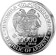 Die Rückseite präsentiert stolz das armenische Staatswappen, umrahmt von der Aufschrift "REPUBLIC OF ARMENIA" in lateinischen und armenischen Schriftzeichen. Der imposante Nennwert von 10.000 Dram unterstreicht den offiziellen Status als gesetzliches Zahlungsmittel.