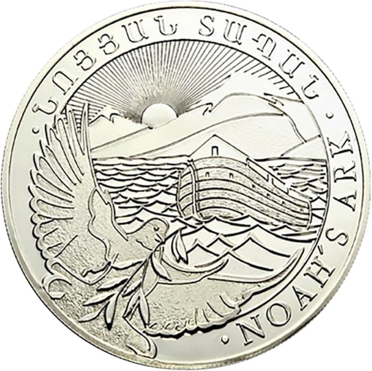 - Motiv: Die Münze zeigt eine Friedenstaube mit einem Ölzweig im Schnabel – ein Symbol für das Ende der Flut und die Wiederherstellung des Lebens auf der Erde.