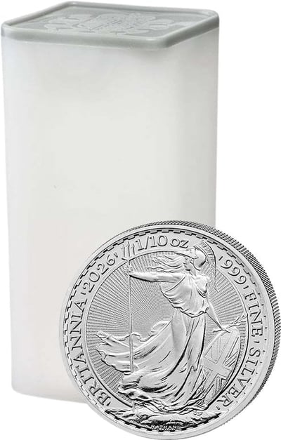 16 x 1/10 Unze Silber Britannia 2026 – Britische Eleganz in kompakter Münztube