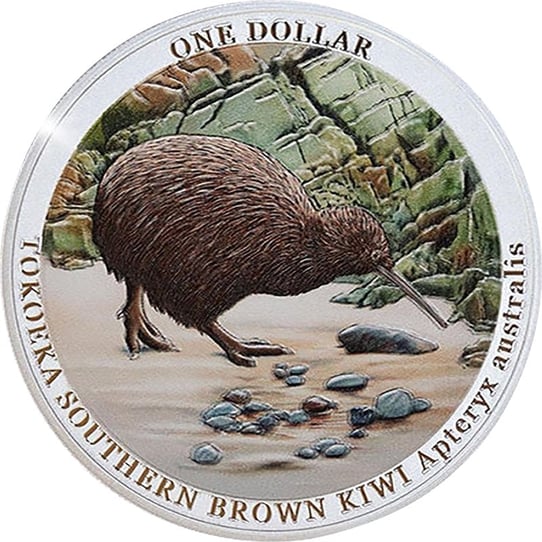 Am oberen Rand der Münze prangt der stolze Schriftzug "ONE DOLLAR", während am unteren Rand der Name des Vogels, "SOUTHERN BROWN KIWI Apteryx australis", die Herkunft unterstreicht. "TOKELAU" und die wissenschaftliche Bezeichnung sind elegant an den Seiten eingraviert, umgeben von einem glänzenden Silberrand, der das Motiv perfekt einrahmt.