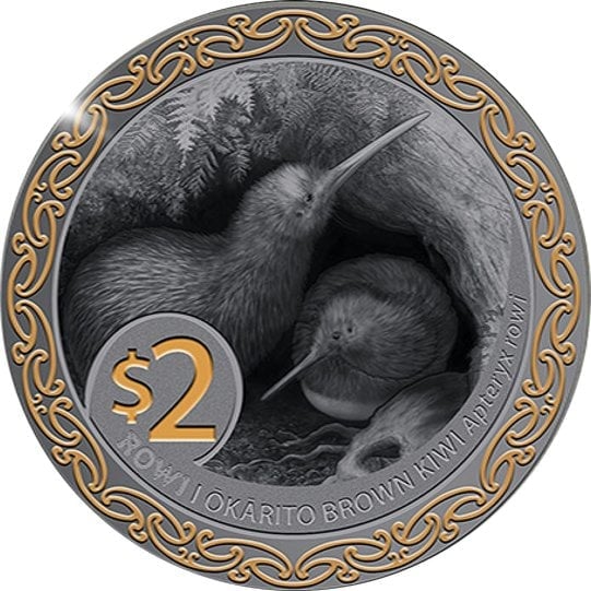 - Nationales Symbol: Zwei detailliert gestaltete Fleckenkiwis als Hauptmotiv