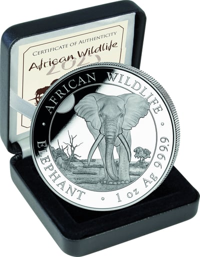 Höchste Prägequalität: Detailreiche Motivgestaltung des beliebten Somalia Elefanten auf reinstem Silber 999,9, veredelt in exquisiter Spiegelglanz-Ausführung