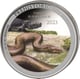 Die farbige Motivseite dieser Silbermünze zeigt die Titanoboa. Die Titanoboa war eine Boa-Art, die schon seit einer langen Zeit ausgestorben ist. Mit einer Länge von ungefähr 14 Metern ist sie die wohl größte Schlange aller Zeiten. In der Epoche „Paläozän“, also zwischen 60 Millionen und 58 Millionen Jahren vor Christus, war der Kontinent Südamerika ihr Zuhause. Besonders der Amazonas, des die Titanoboa war eine erstklassige Schwimmerin. Auch an den Ufern des Amazonas machte sie es sich gemütlich. Aufgrund ihrer einschüchternden Größe soll sie sich unter anderem auch von Krokodilen und Schildkröten ernährt haben. Deshalb ist im Hintergrund des Münzmotivs auch ein Krokodil zu sehen. Ihre Größte ist auch der Grund, warum ihr der Name „Titanoboa“ gegeben wurden, denn die Übersetzung des Namens lautet „riesige Boa“. Giftig war die Boa-Art allerdings nicht. Die Titanoboa war eine Würgeschlange. Die riesige Schlangenart Anakonda stammt von der Titanoboa ab.