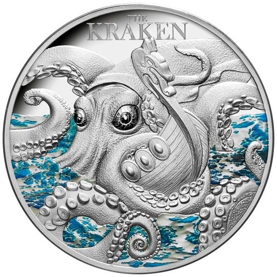 Die Silbermünze besticht durch ihre beeindruckende Darstellung des legendären Kraken. Das Motiv zeigt das Seeungeheuer inmitten von blau gefärbtem Wasser, das eine realistische und eindringliche Atmosphäre schafft. Das Design der Münze ist in High Relief geprägt, was dem Motiv zusätzliche Tiefe und Detailgenauigkeit verleiht. Das Kraken-Motiv auf der Vorderseite der Münze ist von der Aufschrift „THE KRAKEN“ und dem Nennwert von 5 $ umgeben, während die Rückseite das Wappen von Niue sowie weitere nautische Details zeigt. Diese einzigartige und limitierte Münze ist eine perfekte Ergänzung für jede Sammlung von Münzliebhabern und Fans von Meeresmythen und Legenden.
