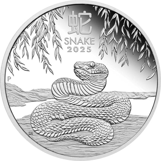 Die Vorderseite der Münze zeigt eine detailliert gravierte Schlange, die sich majestätisch auf einer ebenen Fläche windet. Die texturierte Haut der Schlange mit ihren sichtbaren Schuppen und der erhobene Kopf verleihen dem Motiv eine beeindruckende Realitätsnähe. Umgeben von stilisierten Pflanzen und Ästen, die den Rand der Münze berühren, wird das Hauptmotiv kunstvoll eingerahmt. Das chinesische Schriftzeichen für Schlange, der Schriftzug "SNAKE 2025" sowie das Münzzeichen "P" und die Initialen "SR" des Designers runden das Design ab.