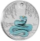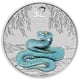 Einzigartiges Design: Die kunstvoll colorierte Schlange in faszinierenden Blautönen, umrahmt von filigranen Weidenblättern, zeigt höchste Prägekunst der Perth Mint