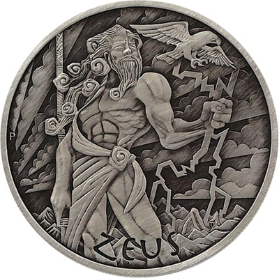 Die erste Münze der Serie ist dem griechischen Göttervater Zeus gewidmet. Zeus und seine Geschwister mussten ihren Vater Kronos sowie die riesigen Titanen bekämpfen, um die Herrschaft über die Welt zu erringen. Nachdem die Götter die Titanen besiegt haben begann laut der griechischen Mythologie das Leben und die Menschen waren ein Geschenk von Zeus.