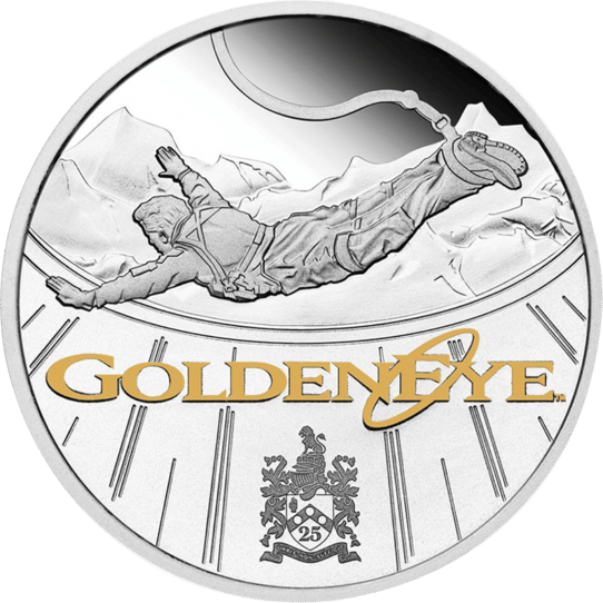 25 Jahre ist es schon her, dass Pierce Brosnan erstmals in die Rolle des MI6 Agenten James Bond schlüpfte. Anlässlich dieses Jubiläums kreierte die Perth Mint diese wunderschöne, teilvergoldete Münze. Das Motiv der Münze zeigt den berühmtesten Bungee Sprung der Welt und mit 220 m Höhe seinerzeit auch Weltrekord. Die Schlüsselszene wurde auf dem Verzasca Staudamm im Tessin gedreht und als bester Film-Stunt aller Zeiten ausgezeichnet. Unter dem Hauptmotiv ist in goldener Schrift der Filmtitel Golden Eye zu lesen.
