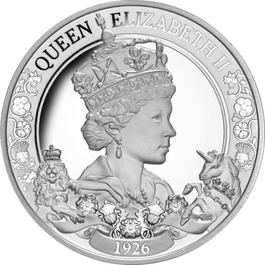 Die Münze zeigt uns ein Bild der Königin aus jungen Jahren, mit ihrem Geburtsjahr 1926.