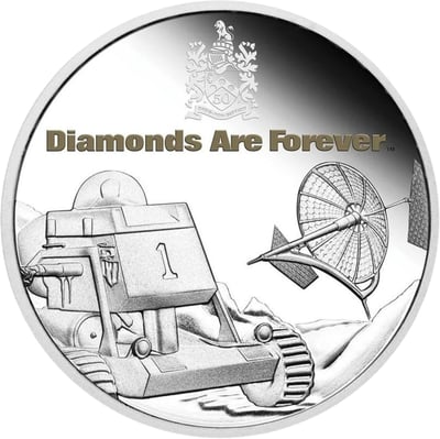 Auf der Motivseite ist zum einen das Mondfahrzeug zu sehen und zum anderen der Satellit, um den sich der Diamantenraub letztlich dreht. Denn mit der Beute soll ein technisch weit überlegener Satellit gebaut werden, um die Macht des Bösen auszuweiten. Mit dem Familienwappen von James Bond, das sich oben auf der Münze befindet, sind letztlich alle wichtigen Elemente der legendären Geheimagenten-Serie stilvoll vereint. Auf dem Familienwappen von Bond steht in Latein „Orbis Non Sufficit“ und damit „Die Welt ist nicht genug“. Nicht zu vergessen ist der vergoldete Schriftzug „Diamonds Are Forever“. Die Wertseite ziert das Porträt von Queen Elizabeth II. Rund um das Porträt stehen die Schriftzüge „2021“, „1oz 9999 Ag“, „QUEEN ELIZABTEH II“, „1 DOLLAR“, sowie „TUVALU“. Tuvalu ist dabei ein Inselstaat im Pazifischen Ozean.