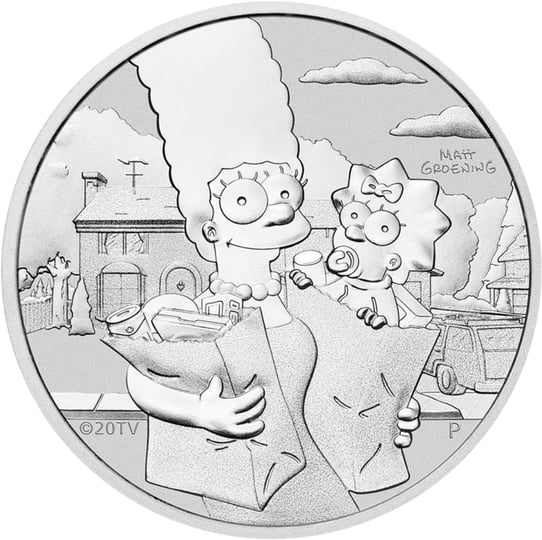 Die Simpsons™ ist eine US-amerikanische Zeichentrickserie, die von Matt Groening erschaffen wurde. Die erste Folge wurde bereits im Jahr 1989 ausgestrahlt. Mittlerweile gibt es 34 Staffeln und über 700 Episoden. Im Jahr 2023 wurde bekannt gegeben, dass es auch eine 35. und 36. Staffel geben wird. Bei den Simpsons™ dreht sich alles um die gelben Bewohner der fiktiven Stadt Springfield. Im Zentrum steht die Familie Simpsons, die aus Homer, Marge und ihren Kindern Lisa, Bart und Maggie besteht. Auf der Motivseite dieser Silbermünze sind Marge und die kleine Maggie abgebildet. Marge kommt offensichtlich gerade von einem Einkauf beim Supermarkt zurück. Sie steht vor ihrem großen Haus und hält zwei Papiertüten voller Lebensmittel in den Händen. Die kleine Maggie schaut aus einer der Papiertüten heraus. Sie hat eine Schleife in ihrem Haar und einen Schnuller im Mund. Mit all den Einkäufen hat Marge einfach keine Hand mehr frei, um ihre Tochter zu tragen. Marge trägt ihr charakteristisches Kleid und ihre Perlenkette. Die Figuren aus der Zeichentrickserie sind bekannt dafür, immer gleich auszusehen und gleich alt zu sein. Neben ihrem Outfit sind auch Marges Haare ihr Markenzeichen. Ihre blauen Haare fallen nicht runter, sondern stehen ab wie ein Turm.