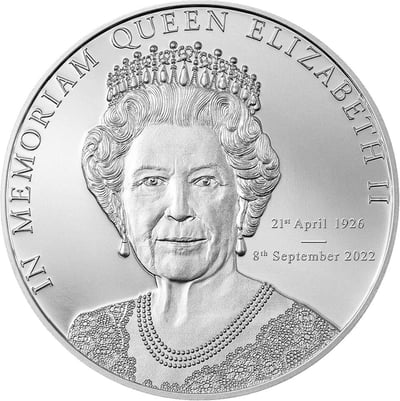 Dieser Silbermünze wurde herausgebracht, um an die verstorbene Queen Elizabeth II zu erinnern. Auf der Motivseite ist aus diesem Grund ein Bildnis der Monarchin zu sehen, auf dem Sie eine Krone, diversen Schmuck und ein schönes Kleid trägt.