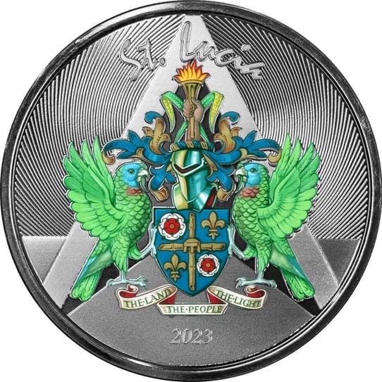 Das farbenfrohe Wappen in der Mitte der Münze, flankiert von zwei grünen Papageien, repräsentiert die lebendige Natur und das kulturelle Erbe von St. Lucia. Das Wappen, geteilt in vier Felder mit Rosen und Lilien, wird gekrönt von einem Ritterhelm und einer Flamme, welche die Unabhängigkeit und das Licht des Landes symbolisieren. Unterhalb des Wappens ziert der Leitspruch "THE LAND, THE PEOPLE, THE LIGHT" ein Banner, das die Verbundenheit der Bürger zum Ausdruck bringt.