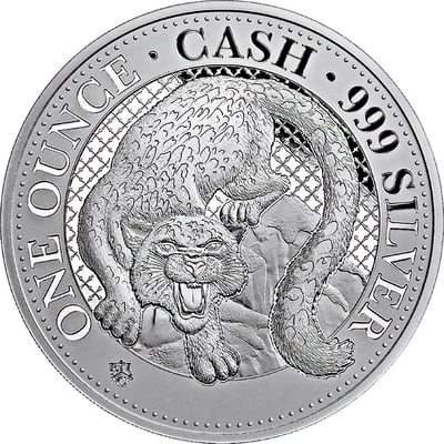 Die Münze besticht durch ihr atemberaubendes Design: Auf der Vorderseite thront ein majestätischer Schneeleopard in voller Pracht auf einem Felsen, umgeben von einem feinen Gittermuster, das die Wahrnehmung des Betrachters einfängt und die Detailgenauigkeit der Prägung hervorhebt. Der Schriftzug "CASH" ziert den oberen Rand, während "999 SILVER" am unteren Rand eingraviert ist und das Gewicht "ONE OUNCE" die Mitte schmückt. Das präzise geprägte "pti"-Symbol steht dabei für die herausragende Qualität und Authentizität der Münze.