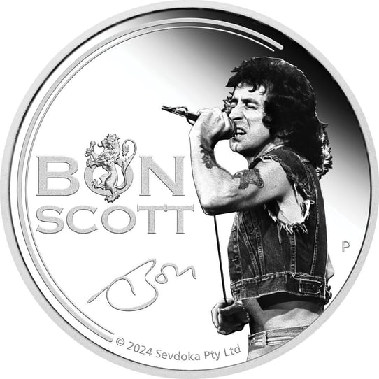 Die Münze zelebriert Bon Scotts unvergessliches Erbe und präsentiert ein coloriertes Porträt des legendären Sängers, das von einem heraldischen Löwen und seiner unverwechselbaren Signatur umrahmt wird. Das Design ehrt nicht nur den Künstler, sondern auch die Kraft und Energie der Musik von AC/DC.