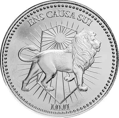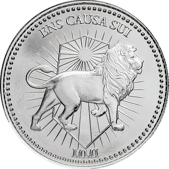 Die Vorderseite dieser beeindruckenden Medaille zeigt einen majestätischen Löwen in Bewegung, vor einem imposanten Schild – ein Bild, das Stärke und Erhabenheit ausstrahlt. Die lateinischen Inschriften „Ens Causa Sui“ und „MMI“ verleihen dem Design eine Aura antiker Mysterien und zeitloser Eleganz.