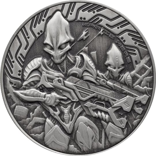 Die Vorderseite der Münze zeigt eine dramatische Szene mit zwei kampfbereiten Aliens, die mit futuristischen Waffen ausgestattet sind. Das aufwendige Antik-Finish verleiht dem Motiv eine besondere Tiefenwirkung und unterstreicht die Details der außerirdischen Krieger. Die Rückseite ziert das offizielle Staatswappen Samoas, umrahmt von einer kunstvollen Gestaltung mit kreisförmigen Elementen.