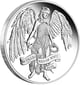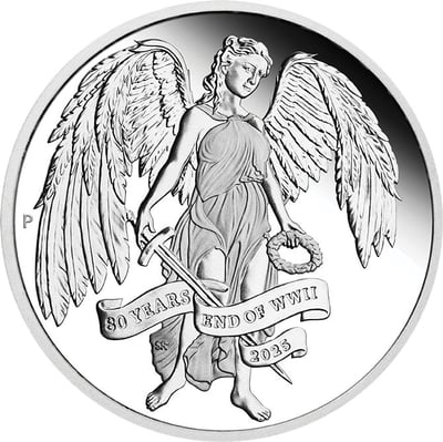 Das zentrale Motiv zeigt die griechische Siegesgöttin Nike, auch bekannt als "Winged Victory", in einer majestätischen Darstellung. Mit ausgebreiteten Flügeln hält sie ein Schwert in der rechten und einen Palmkranz in der linken Hand - Symbole für Sieg und Frieden. Die Banderole mit der Aufschrift "80 YEARS END OF WW II 2025" und das Prägezeichen "P" der Perth Mint vervollständigen das eindrucksvolle Design.