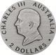 Der imposante Durchmesser von 45,60 mm bietet ausreichend Raum für die kunstvolle Motivgestaltung. Auf der Rückseite präsentiert sich das Porträt von König Charles III. zusammen mit dem Nennwert von 2 Australischen Dollar – ein Zeichen für die offizielle Ausgabe als gesetzliches Zahlungsmittel in Australien.