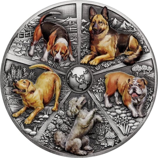 • 5 Unzen reinstes Silber in spektakulärer High Relief Prägung mit farbigen Hundemotiven