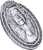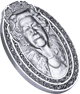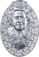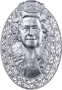 Was diese Münze jedoch wirklich einzigartig macht, ist ihre ovale Form und die kunstvolle Filigrantechnik. Der schmuckartige Rahmen aus feinsten Silberornamenten – verschlungene Ranken und Schnörkel – umgibt das zentrale Portrait wie ein kostbarer Bilderrahmen. Eingebettet in diese filigrane Bordüre funkeln echte Kristalle, die dem Stück einen geradezu juwelenhaften Charakter verleihen.