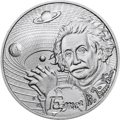 Auf der Vorderseite dieser Silbermünze ist der deutsche Physiker Albert Einstein abgebildet. Dieser ist von mehreren Planeten umgeben. Unter ihm steht die physikalische Gleichung E = mc².