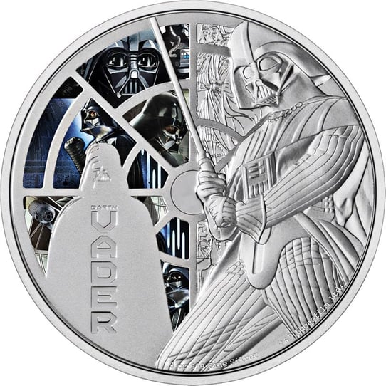 Im Vordergrund sieht man Sith Lord™, der kampfbereit sein Schwert in der Hand hält. Er scheint auf eine Silhouette mit der Aufschrift Vader einschlagen zu wollen. Auf der Rückseite der Münze ist das Porträt der britischen Königin Elizabeth II abgebildet, denn diese ist auch das Staatsoberhaupt von Neuseeland. Der Nennwert von 10 Niue-Dollar und das Prägejahr 2022 sind auch angegeben.