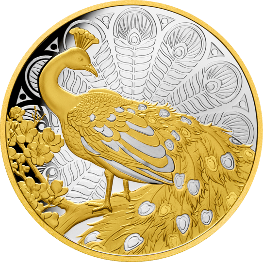 Der majestätische Pfau, der die Vorderseite dieser exquisiten Münze ziert, wird in einem teilvergoldeten Relief dargestellt, das vor einem filigran gestalteten silbernen Hintergrund strahlt. Die Goldapplikationen heben sich dabei eindrucksvoll von der reinen Silber-Oberfläche ab und verleihen dem Motiv eine lebendige Tiefe. Die detailreichen "Augen" auf den ausgebreiteten Schwanzfedern des Pfaus sind ein Symbol für Wachsamkeit und Stärke, was diese Münze zu einem idealen Krisenschutz macht.