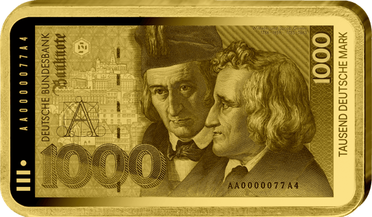 Der legendäre 1000-DM-Schein der Brüder Grimm verewigt in 999,9er Feingold in Polierter Platte