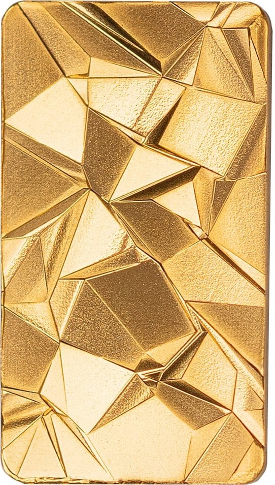 Die spektakuläre Oberflächengestaltung macht diesen Goldbarren zu einem wahren Meisterwerk. Durch innovative 3D-Modellierung und modernste Prägewerkzeuge entstand eine prismatische Struktur, die das Licht auf einzigartige Weise bricht. Jede Facette funkelt und glänzt – ein hypnotisierender Anblick, der an die Brillanz geschliffener Diamanten erinnert. Diese technische Innovation macht jeden einzelnen Barren zu einem unverwechselbaren Unikat.
