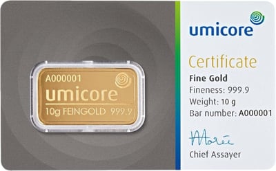 Reinheit & Qualität: 10g feinstes Gold mit 999,9 Feinheit, geprägt mit dem renommierten Umicore Logo