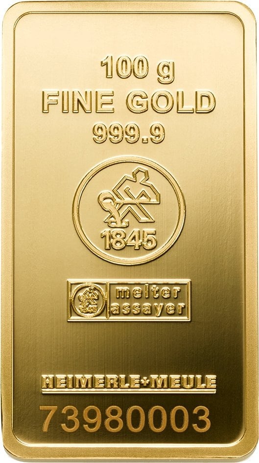 100 g Goldbarren Heimerle und Meule geprägt