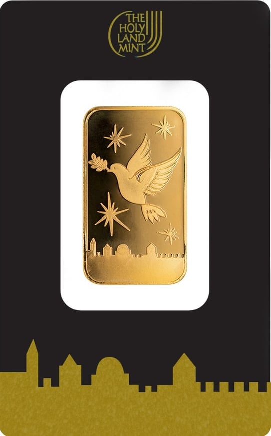 Einzigartiges Sammlerstück: Die detailreiche Friedenstaube über der Jerusalemer Skyline macht diesen 5g Goldbarren der Holy Land Mint zu einem begehrten Sammlerobjekt in höchster Prägequalität