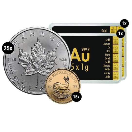 Wer nach Krisen- und Inflationsschutz sucht, der ist mit diesem Paket bestens bedient. Gold, ein absolut krisensicheres Edelmetall, das die Menschheit schon immer faszinierte, ist sowohl in Münzen- als auch in Barrenform vertreten. Silbermünzen sind ebenfalls äußerst wichtig, denn die Nachfrage nach Silber hat in den letzten Jahren nur noch mehr zugenommen, weshalb eine Wertsteigerung wahrscheinlich ist.